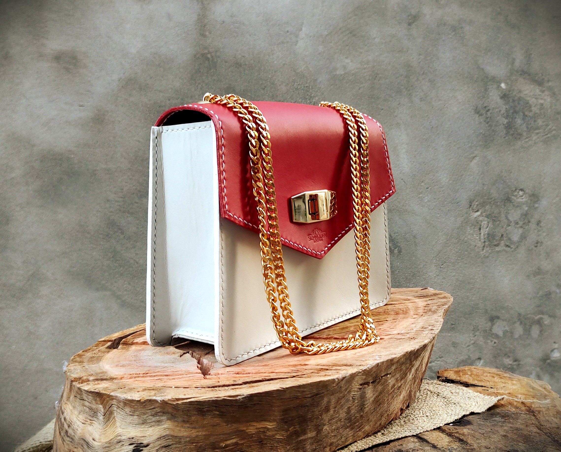 Prática e versátil a bolsa em couro July se destaca pela beleza única, Confeccionada artesanalmente em dois tons de couro: Off White e Vermelho. Bolsa conta com tampa de fechamento, forro interno em couro vermelho, bolso interno também em couro e metais na cor gold.