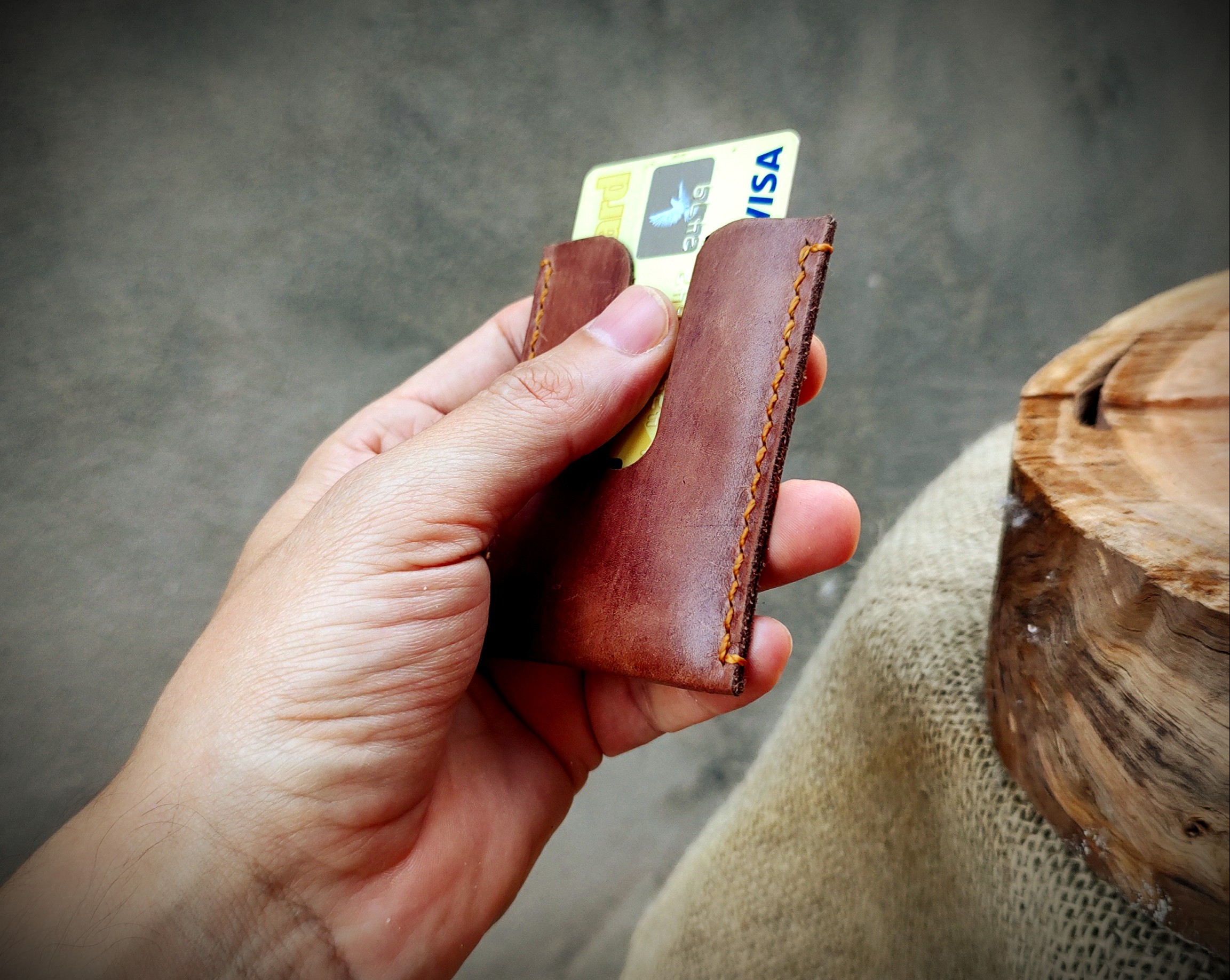 Carteira minimalista Hold Card Slim, é feita em couro vegetal com pintura manual na cor pinhão.