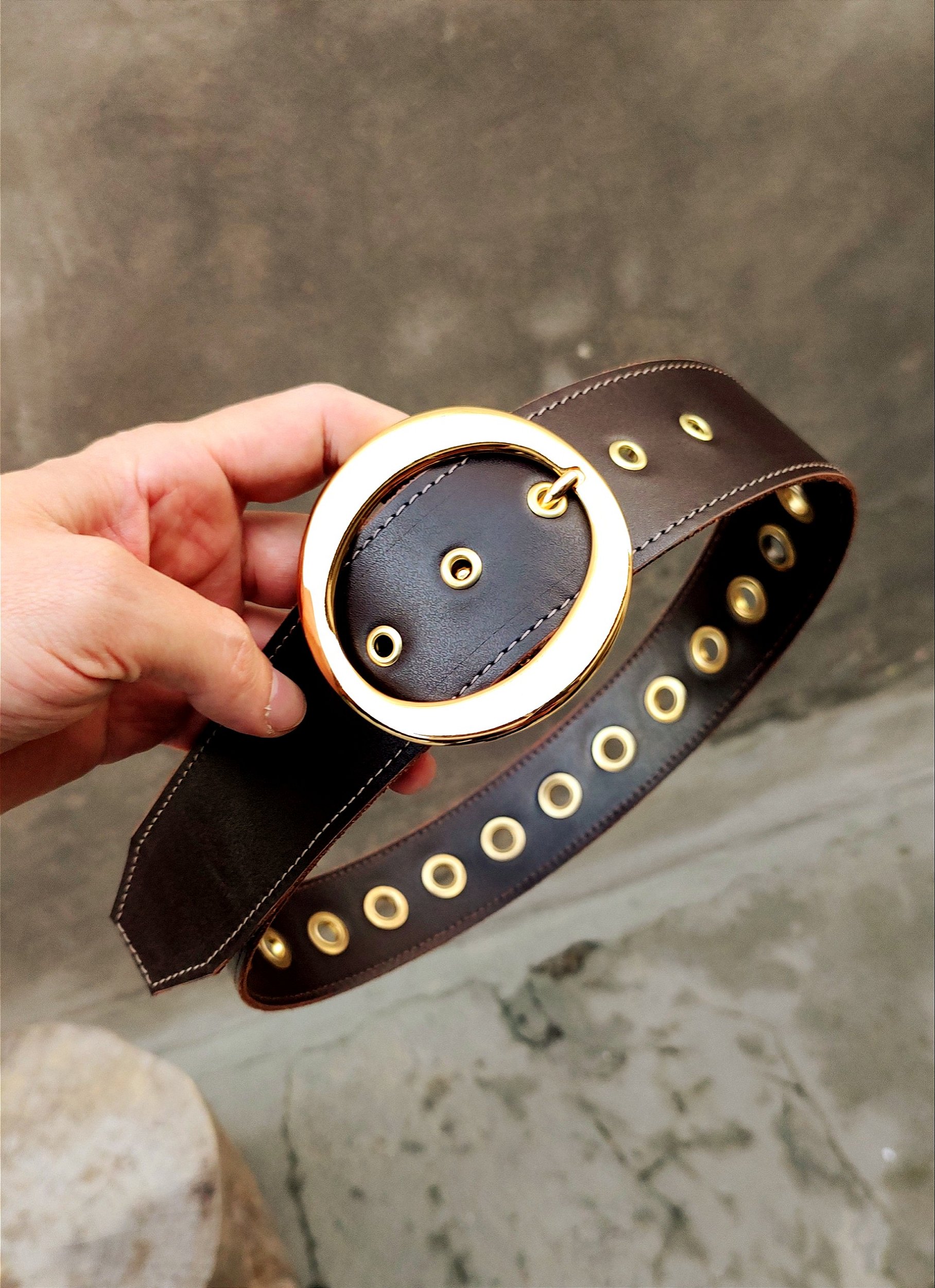 Cinto Ilhós feminino 5.0 é um cinto com largura de 5 cm feito em couro vegetal na cor café e costura na borda com linha de nylon.