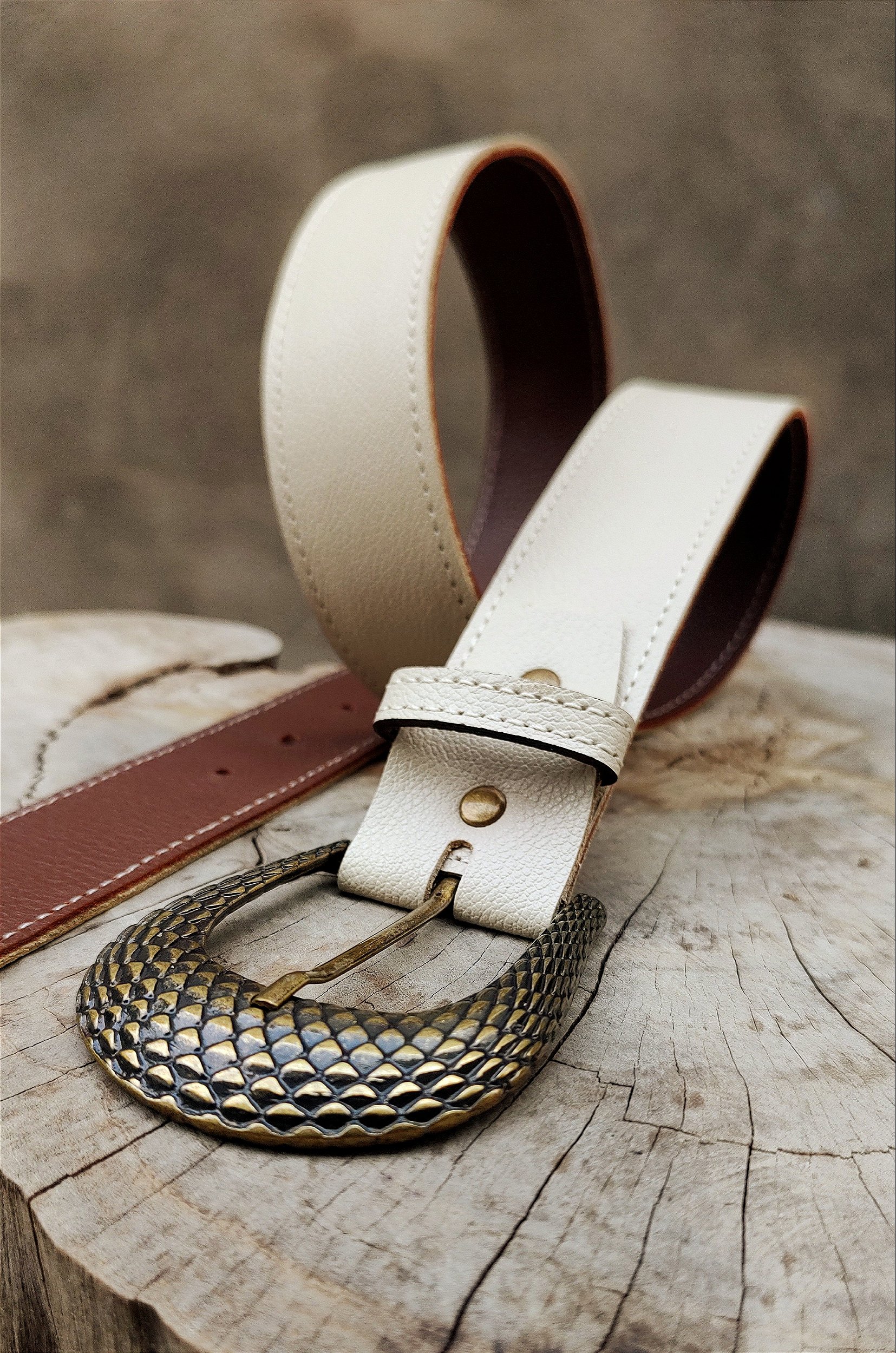 Cinto feminino 4.0 é um cinto com largura de 4 cm feito em couro relax na cor Off White com detalhes em couro castanho, Costura na borda com linha de nylon.