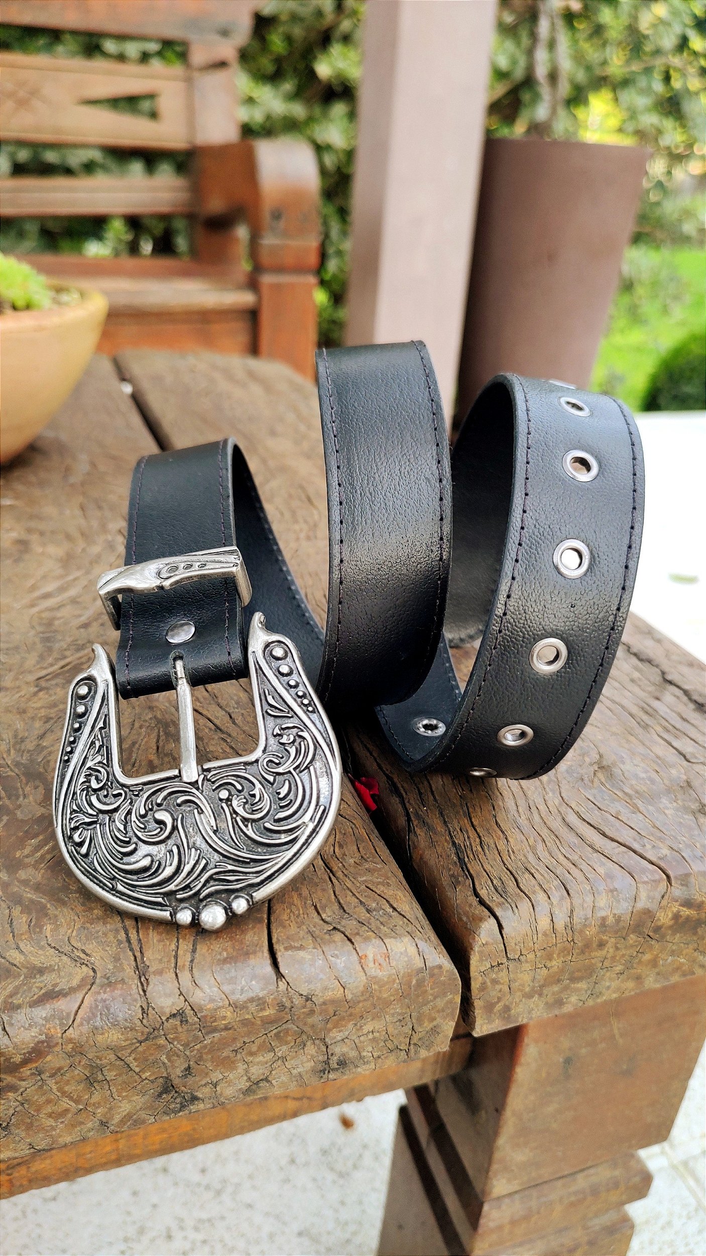 Cinto confeccionado com couro de excelente qualidade na cor preta e fivela exclusiva prata envelhecido com passador metálico